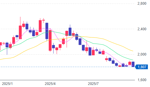 年初からずっと2,000円以上で推移していた株価は、10月1日終値で1,801円をつけ年初来安値を更新しました。10月3日時点では1,807円となっています。
