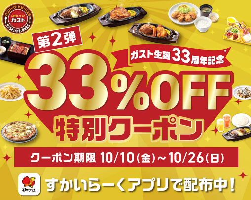 すかいらーくが運営するファミレスチェーン「ガスト」で、33周年記念キャンペーンが開催されています。対象商品10品が大幅な割引になっていてお得ですよ!