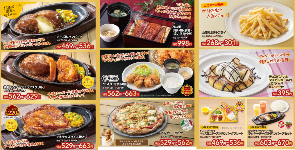 他にも山盛りポテトフライやハンバーグ系など鉄板メニューがばっちり対象です。