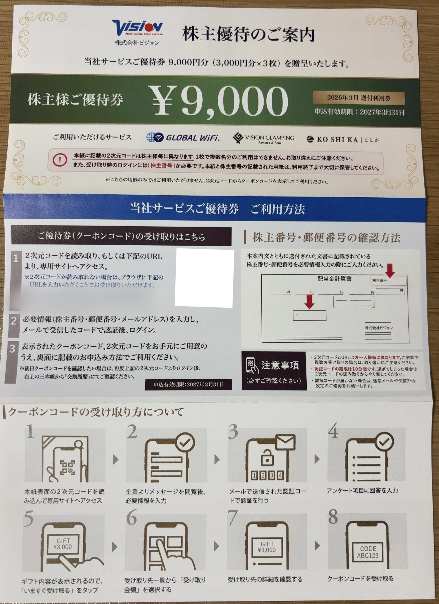 「ビジョン(9416)」から2025年12月期の株主優待案内が到着しました。