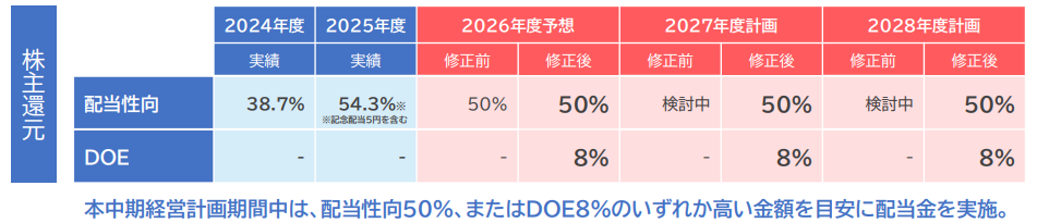 もともと優待改悪する代わりに、「2026年まで配当性向50%にするよ!」という発表がありましたが、