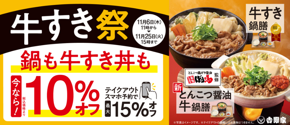 現在吉野家では、牛すき鍋キャンペーンを実施中。スマホ予約でテイクアウトすると15%オフという太っ腹っぷり。