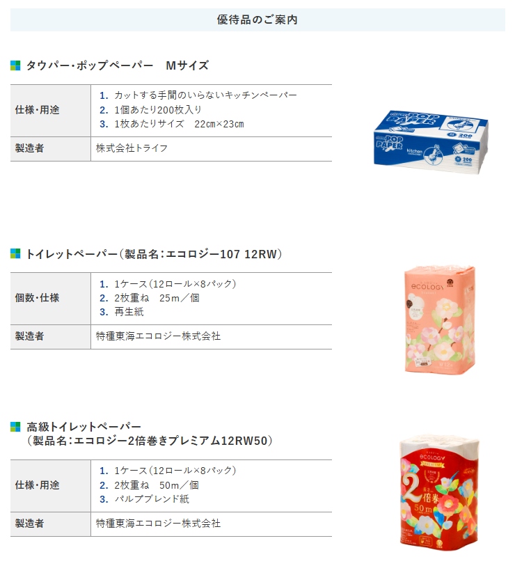 900株以上 | ①トイレットペーパー 12ロール×8パック ②タウパー・ポップペーパー M200枚×12個 | ①高級トイレットペーパー 12ロール×8パック ②タウパー・ポップペーパー M200枚×18個 |