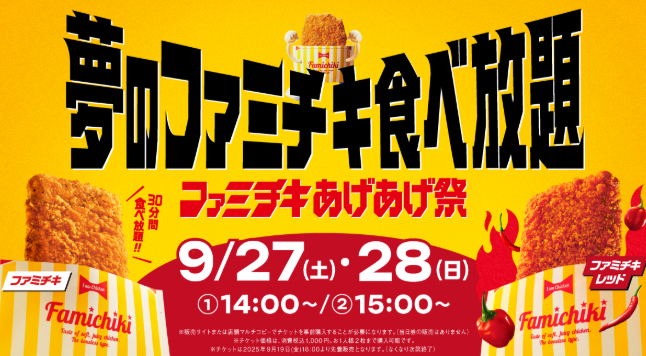 参加費は税込1,000円。夢の30分一本勝負で、ファミチキとファミチキレッドを“おかわり自由”で食べ尽くせます。