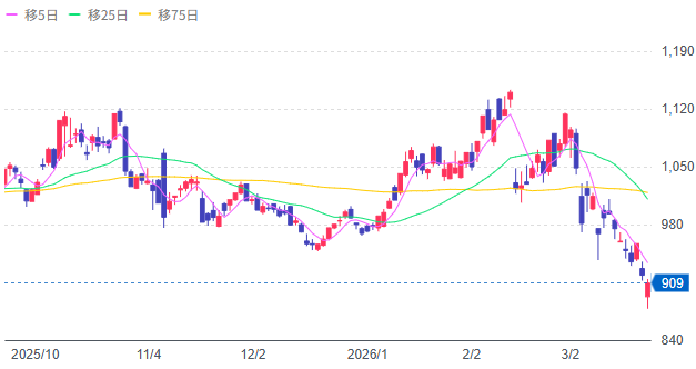 2026年2月頃までは1,100円台で推移していた株価ですが、足元では日経平均の下落もあって…900円前後に低迷しています。