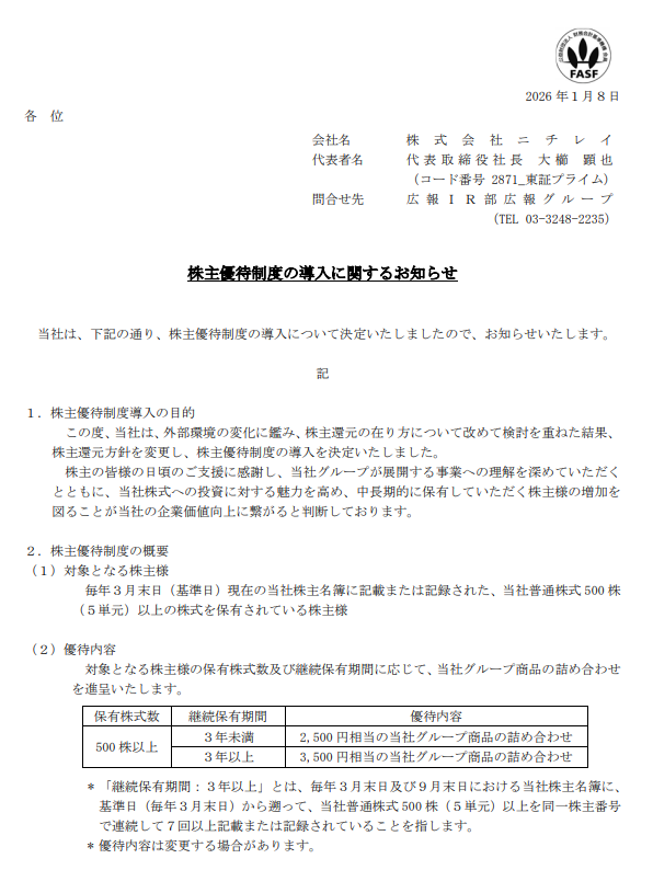 「おおっ、ついにニチレイも優待導入か!1」