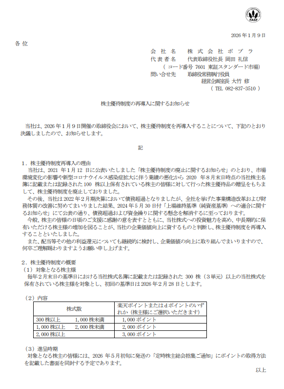 2026年1月9日、「ポプラ(7601)」が株主優待制度の導入(実質的な再開)を発表しました。