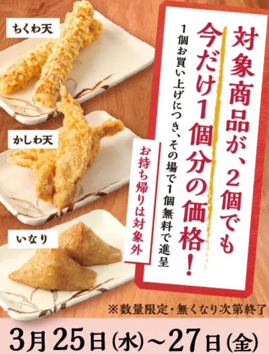 「天ぷら1個買うともう1個無料」