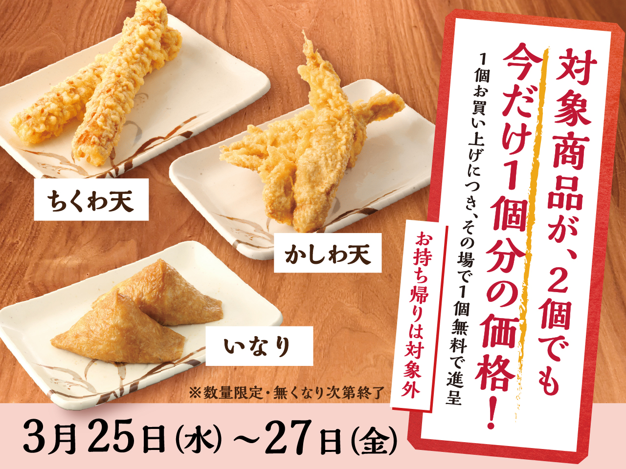 今だけ、対象商品を1個買うともう1個もらえる!天ぷら人気No.1 「かしわ天」どんなうどんにも合う「ちくわ天」お店でつくる、ふっくら「いなり」も!