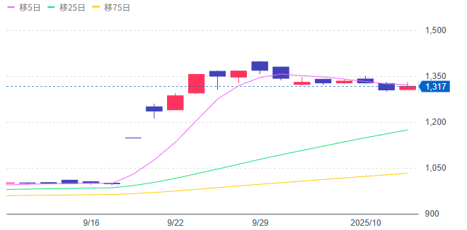 1,000円程度だった株価は、発表直後から勢いよく上昇しましたが、その後は1,300円台で停滞模様。