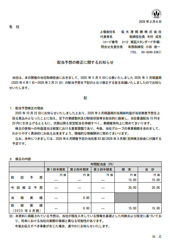 2026年2月6日に「塩水港精糖(2112)」から発表された第三四半期決算と配当予想修正ニュースのお話です。