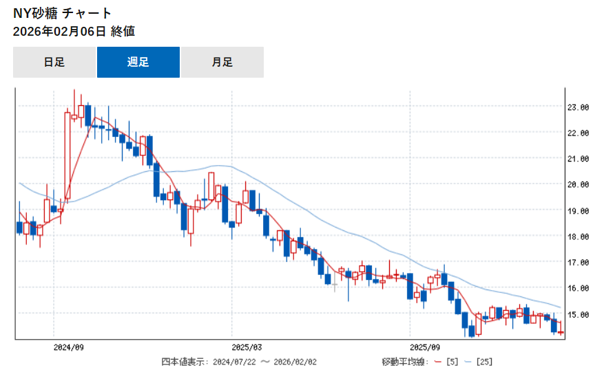 日本の製糖企業は砂糖原料(粗糖)の大半を輸入に頼っています。国際相場は一時期の高騰を乗り越えて今期は安定推移しています。