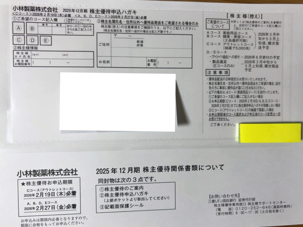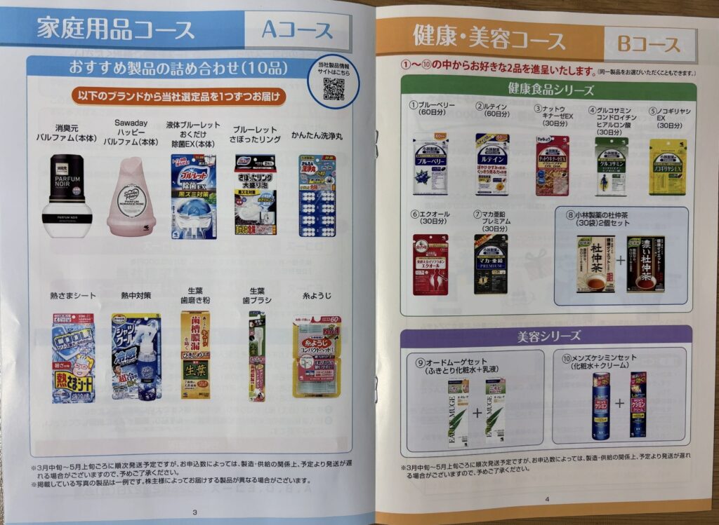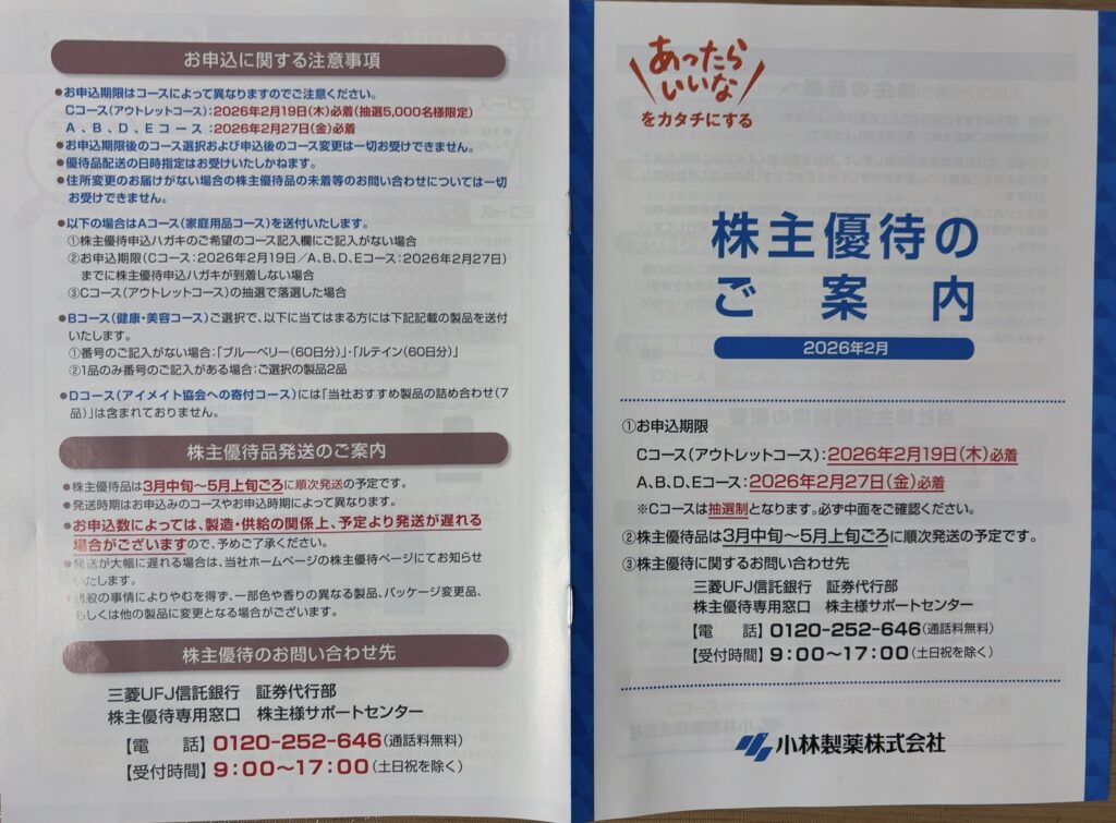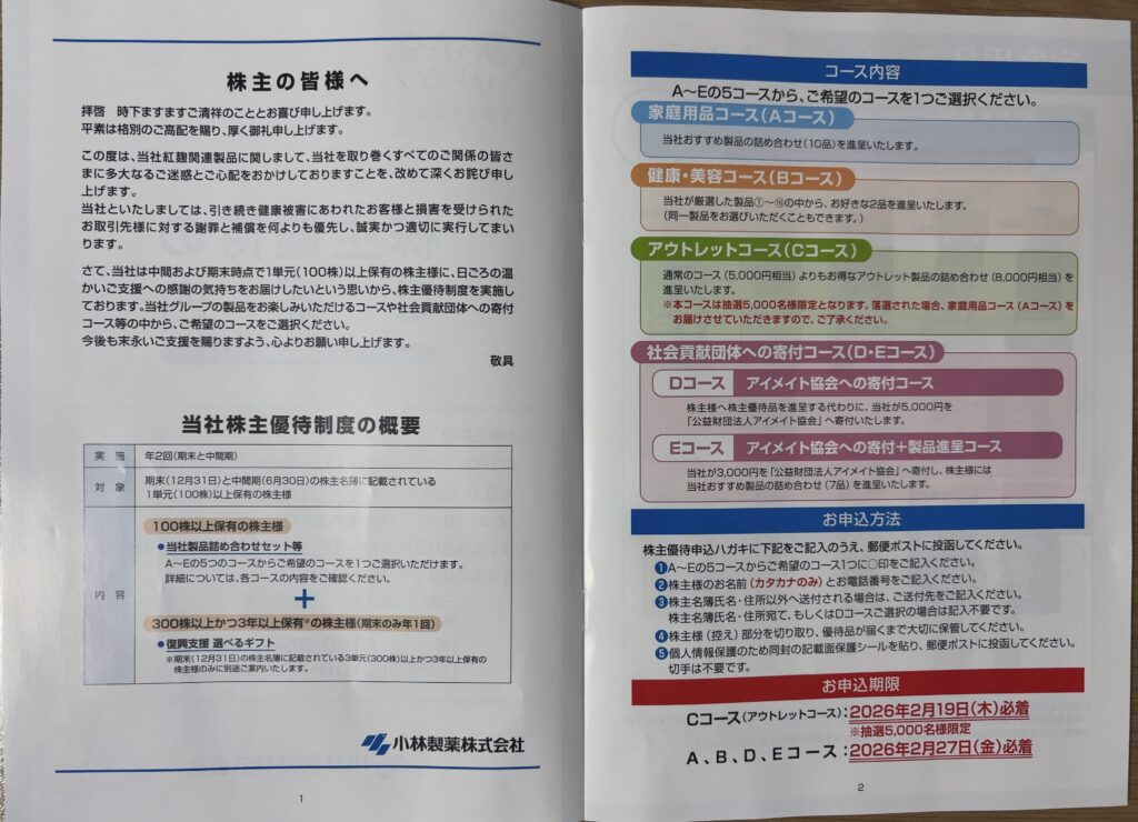 2026年2月10日、「小林製薬(4967)」から2025年12月期の株主優待案内が到着しました。今回、いろいろなコースから選べる仕様になっています。