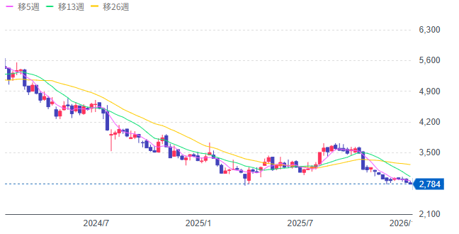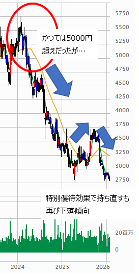 新NISAがスタートした2024年初頭には5000円を超えていた株価が、現在は約半値の2700円台。