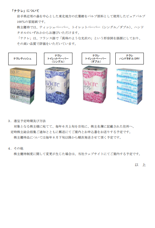 銘柄株価配当利回りトイレットペーパー優待最低投資額継続保有条件