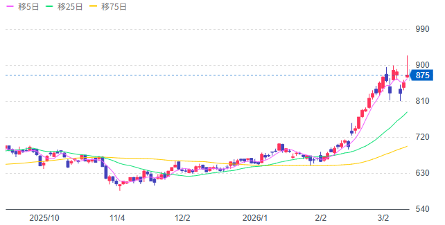 2026年2月13日に株主優待制度の導入を発表したところ、700円程度だった株価がどんどん上昇し約一ヶ月で900円近くになっています。