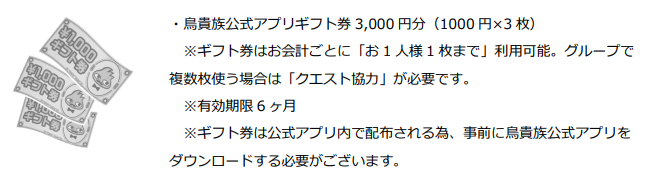 1️⃣ 鳥貴族公式アプリギフト券3,000円分(1,000円×3枚)