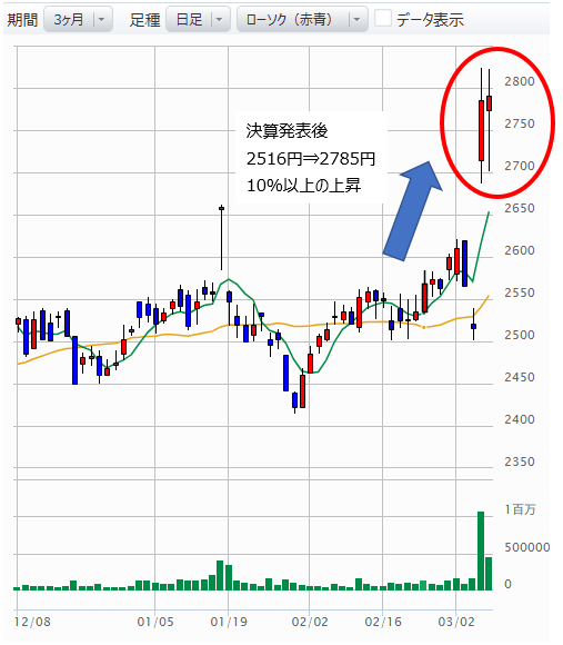 決算発表後、株価は約10%上昇しました。