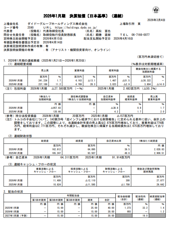 そんな自販機ビジネスを国内事業の主軸に据える「ダイドーグループホールディングス(2590)」が2026年1月期の決算を発表しました。