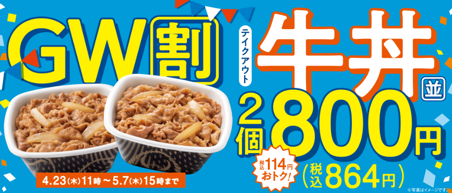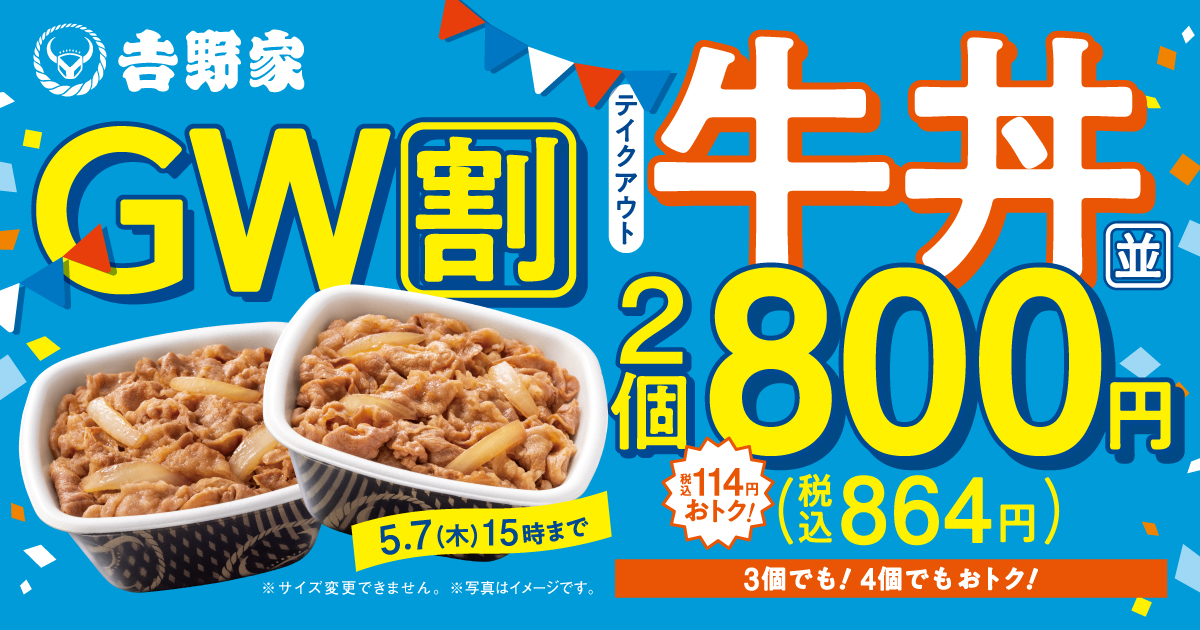 GW割!【テイクアウト限定】牛丼並盛2個以上がお得! | 株式会社吉野家の公式ホームーページです。牛丼をはじめとしたバラエティー豊かな吉野家メニューや店舗情報、アルバイト募集情報などを掲載。